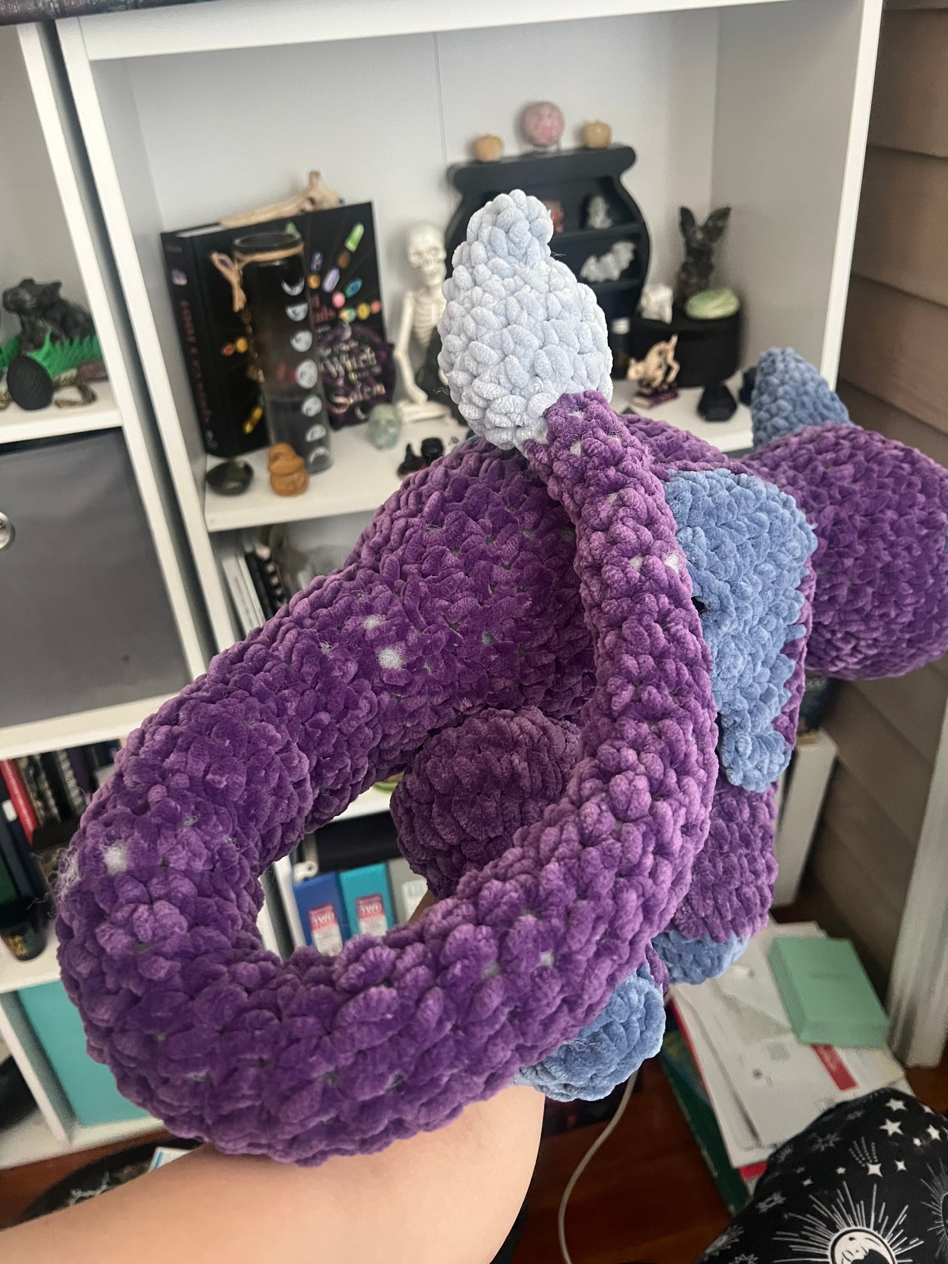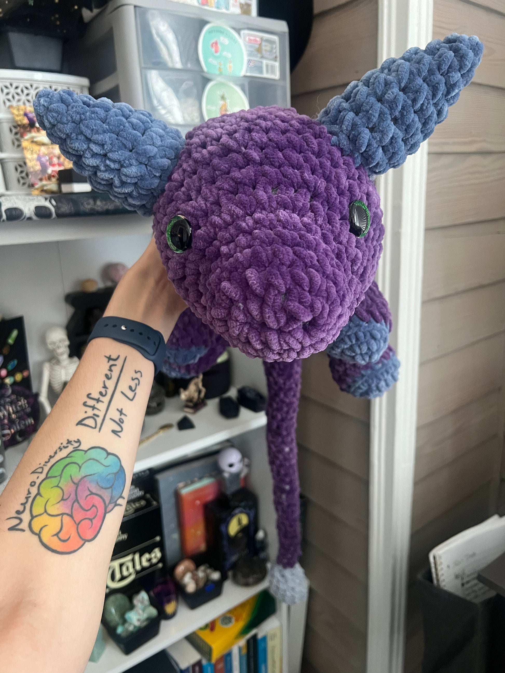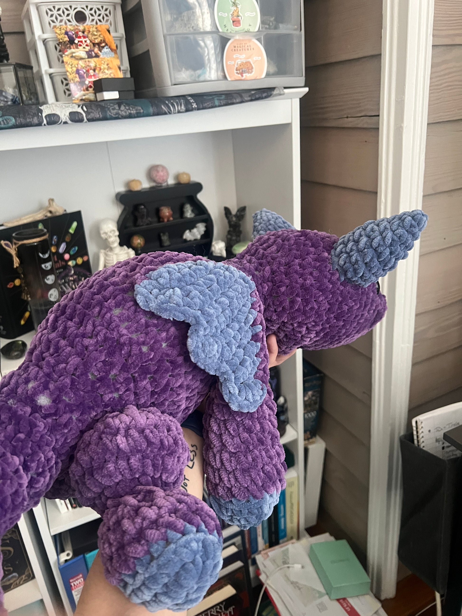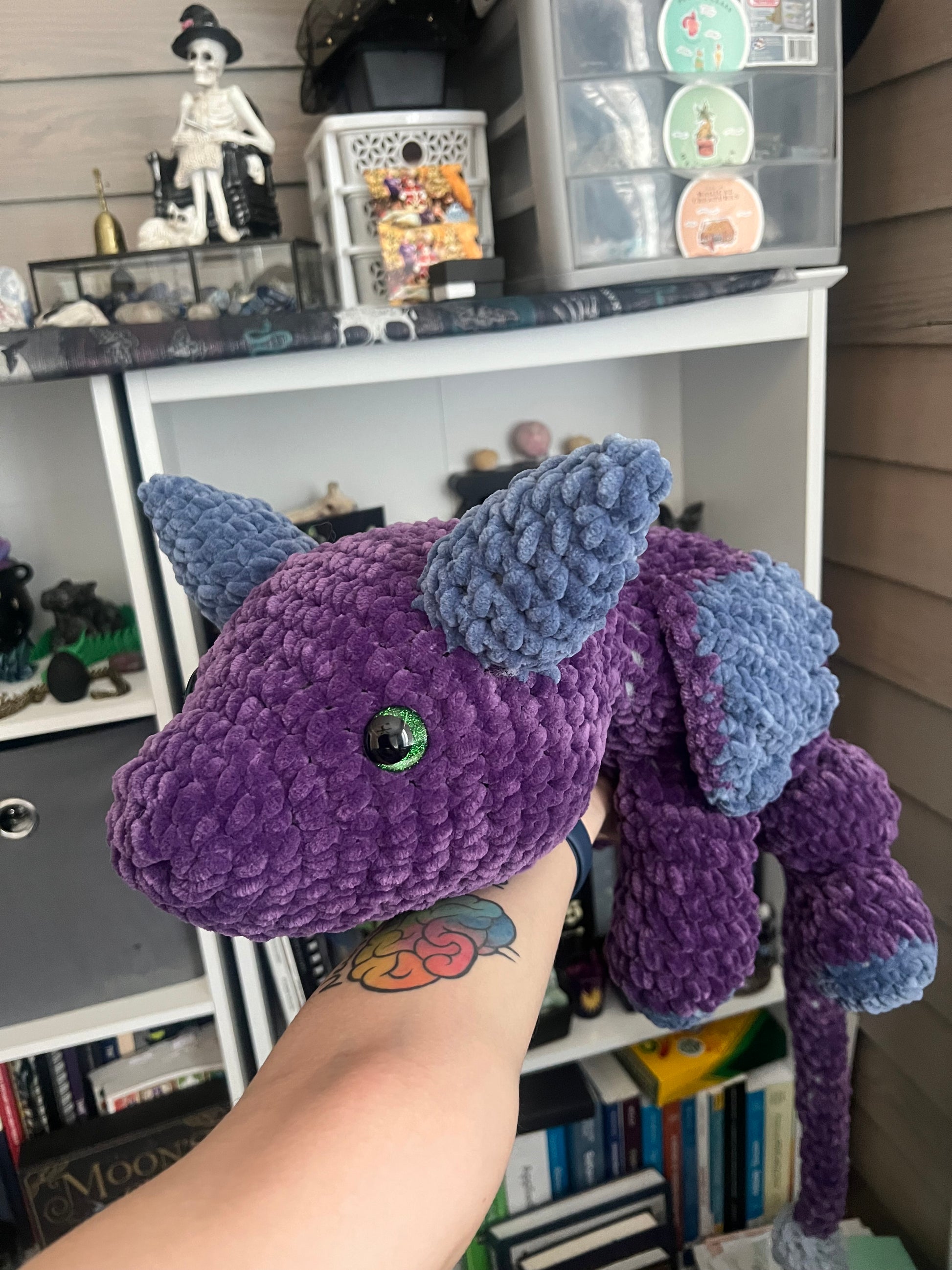 Garth is a 4 legged, 2 winged dragon. He has a dark purple body, green eyes and blue accents.