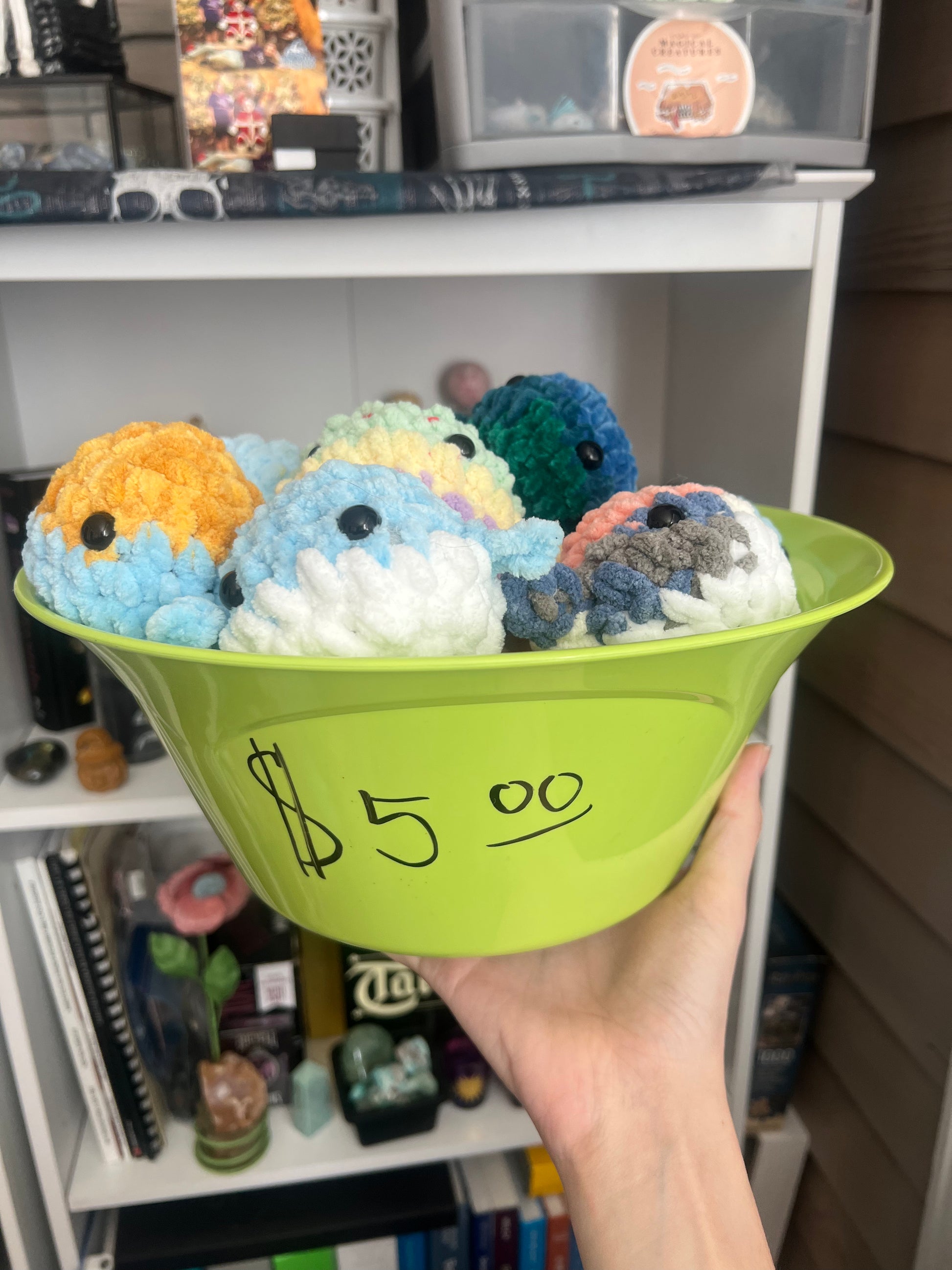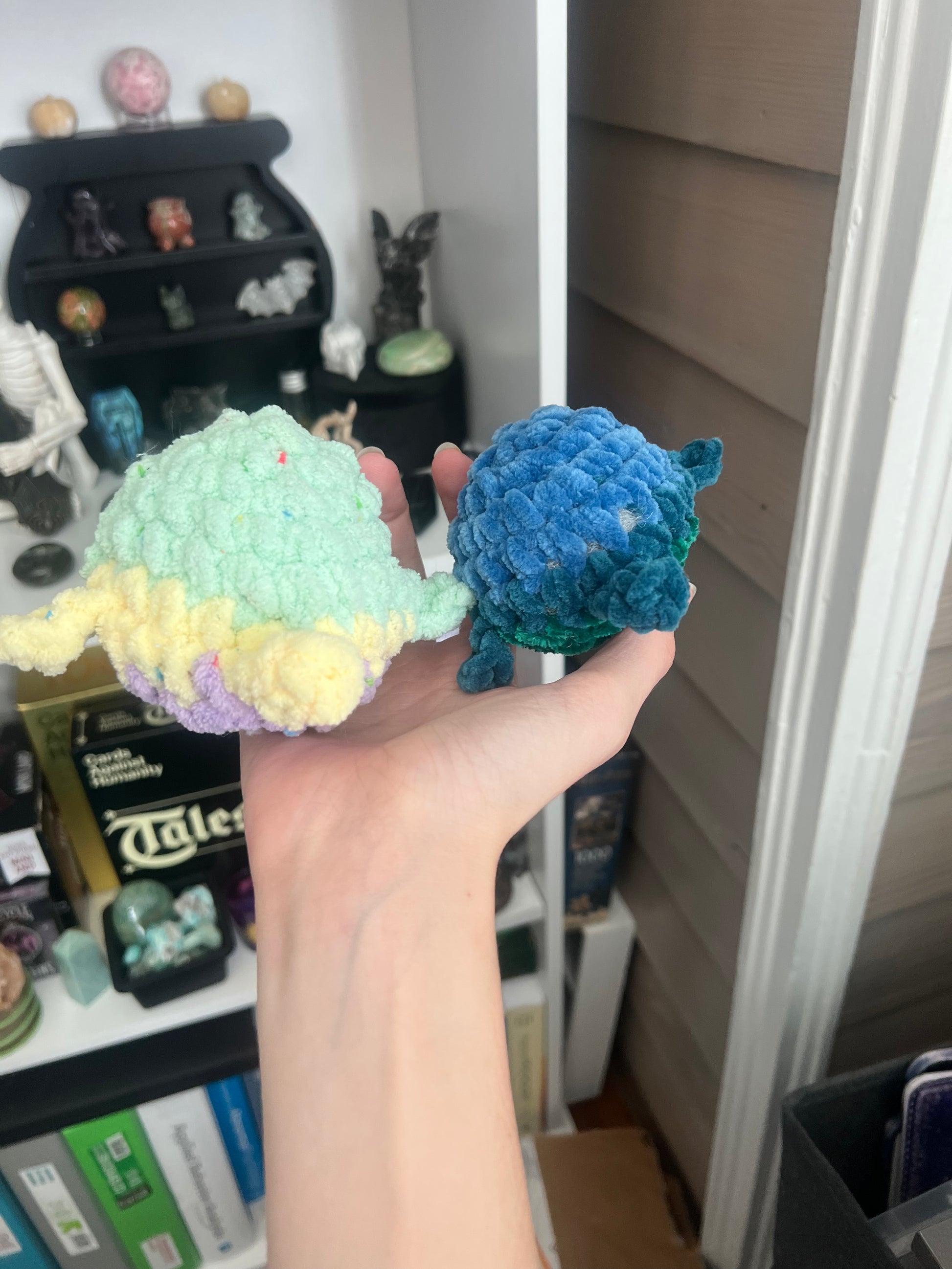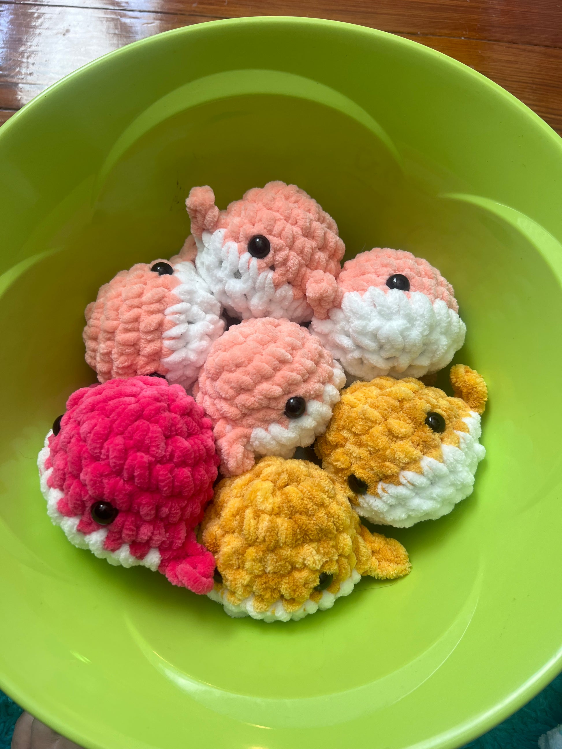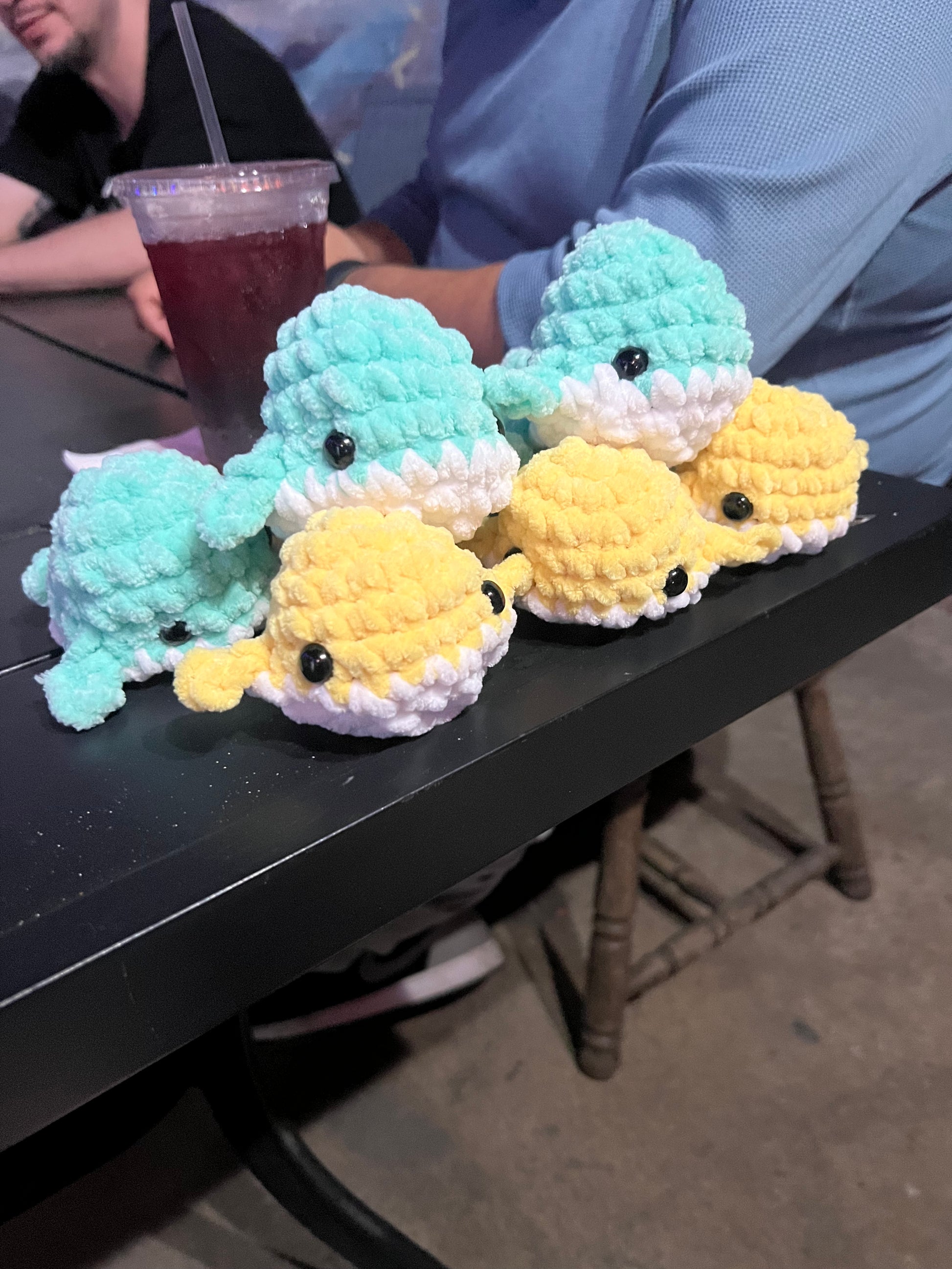 Free pattern from AllfromJade shown to me by another crafter at a workshop! Easy to make with any type of fluffy yarn. When ordered, you will receive a random whale with any potential color palette; this could be any color of the rainbow or variegated yarn.