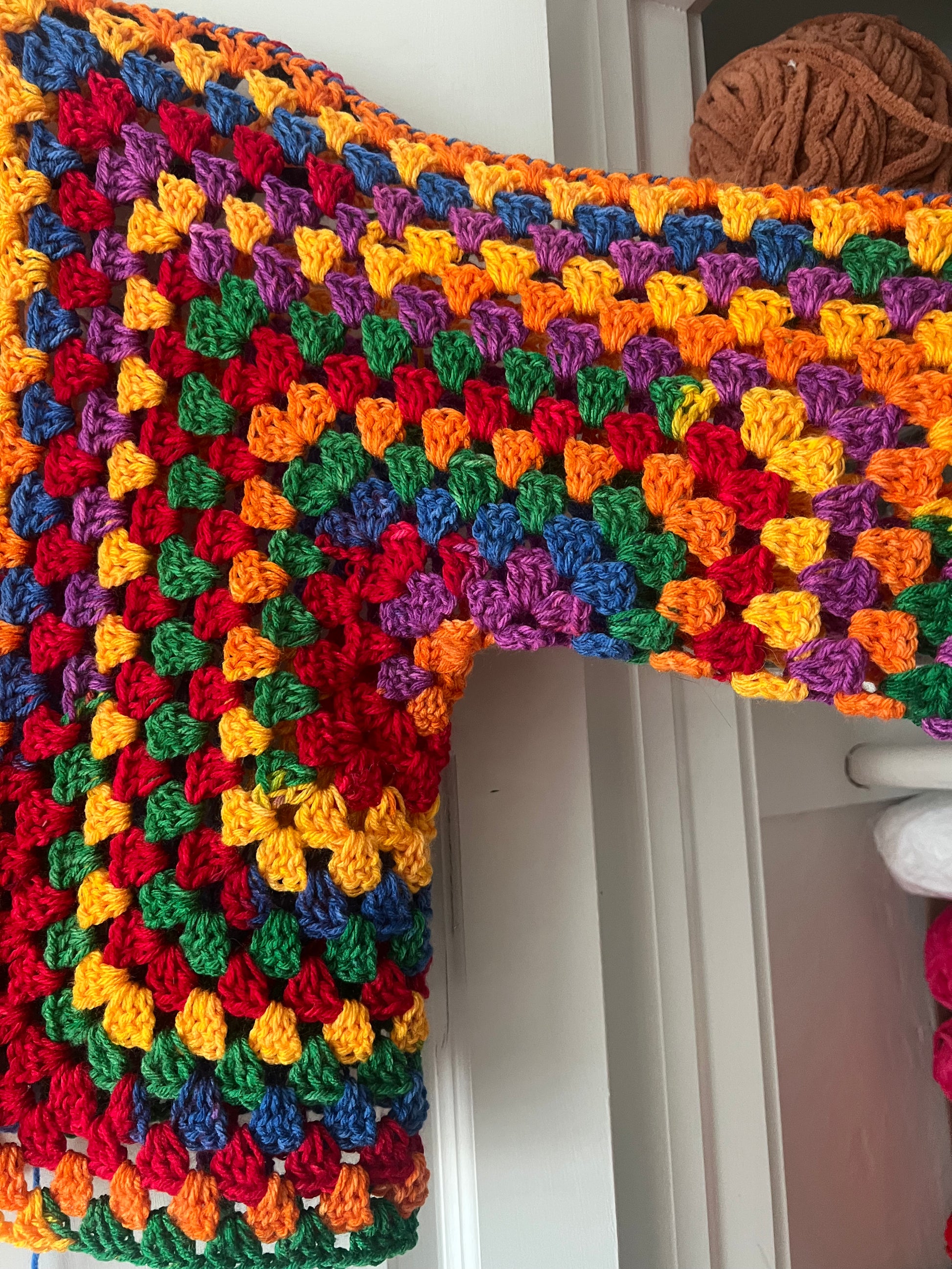 This handmade hexagon cardigan is crocheted with Joann’s Limited Edition Rainbow yarn, bursting with vibrant color transitions from red to violet. The open-front design and relaxed, cozy fit make it perfect for layering, while the bold colorway creates a fun, eye-catching statement. Because the yarn is limited edition, each cardigan is truly one-of-a-kind—once it’s gone, it’s gone! A bright, joyful piece for anyone who loves stand-out color.